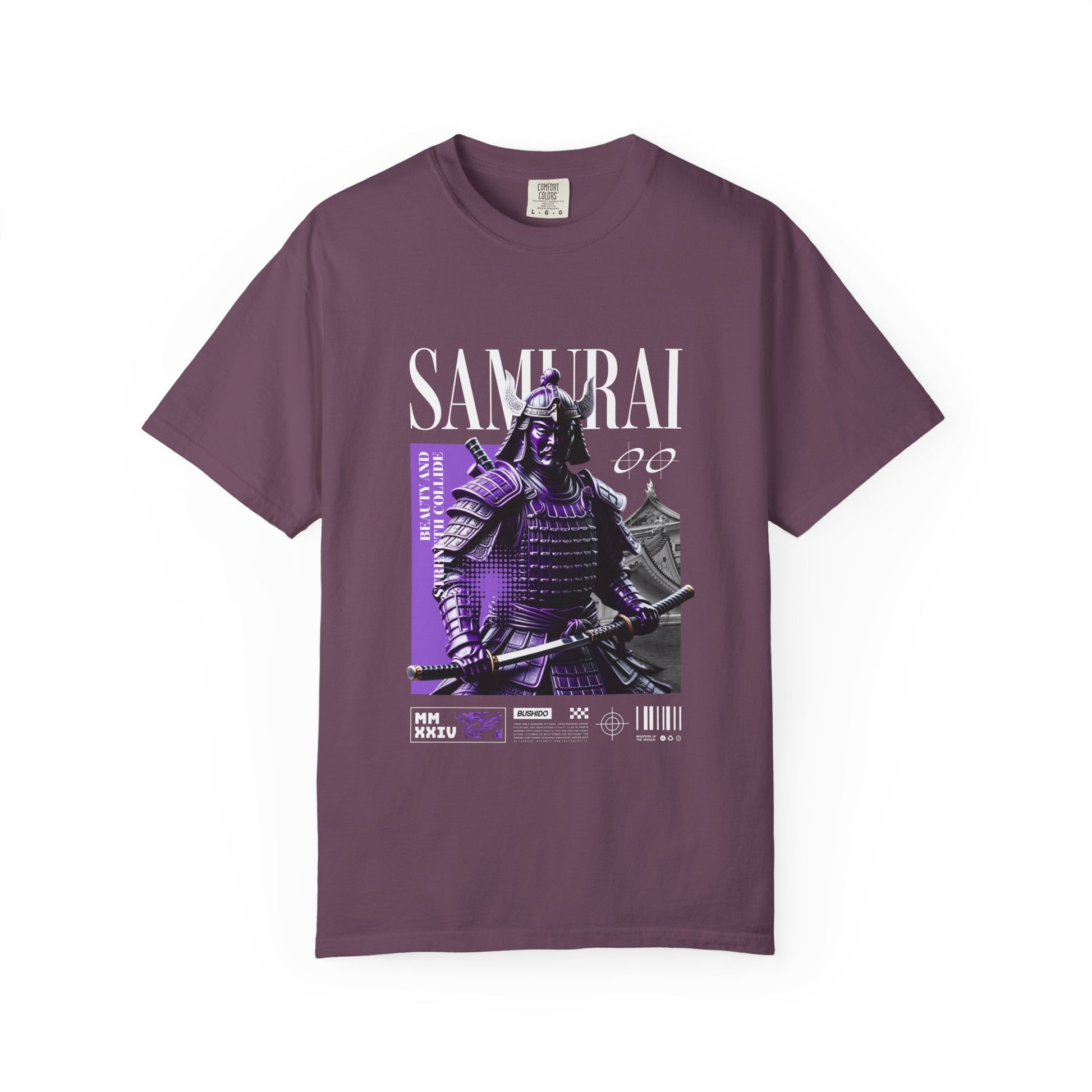 A heavyweight, garment-dyed tee that wears in like a favorite relic. The front features a bold samurai print in high-contrast purple and white, lending a modern, streetwise edge to traditional armor imagery. Soft, pre-shrunk ring-spun cotton and the garment-dyed finish give the shirt a muted, lived-in color and a comfortable hand from the first wear. Cut with a relaxed fit and double-needle stitched seams, it stands up to frequent wear while keeping a casual, layered look for everyday outfits. Sized from S to 4XL and available in many colors, this tee blends historical attitude with contemporary design for collectors of martial aesthetics and fans of urban, retro-futuristic style.